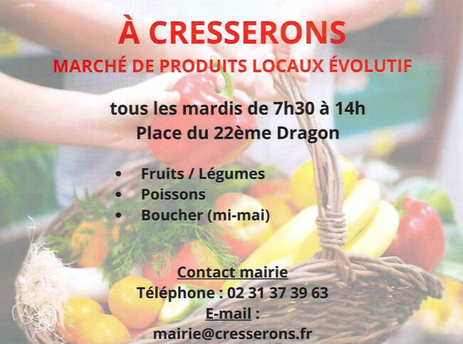 Tous les mardis de 7h30 à 14hPlace du 22e Dragon•Fruits / Légumes•Poissons•Boucher (mi-mai) Contact mairieTéléphone : 02 31 37 39 63E-mail : mairie@cresserons.fr